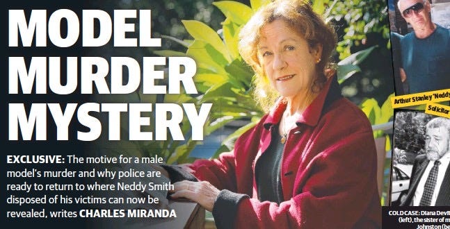When I found her name linked to an article on a missing male model from 1986, I thought for sure this had to be a different Diana, but the location was Australia. How many Diana Devitt-Dawsons are there on one continent? I was able to confirm her identity in one source that included a photograph. Yes, this scholar of posture, this siren of ASMR, is connected to a murder.